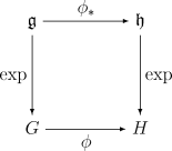指数映射还联系着李群同态。也就是说,若 $\phi : G \to H$ 是一个李群同态,而 $\phi_{*} : \mathfrak{g} \to \mathfrak{h}$ 是其在对应李代数上的诱导映射,则对所有 $x \in \mathfrak{g}$,都有 $$ \phi( \exp\left(x\right) ) = \exp\left(\phi_{*}(x)\right) .~ $$ 换句话说,下图是交换的:\(^\text{[27]}\)