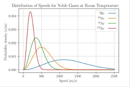 这在近似理想的单原子气体(如氦气)中效果很好,同时也适用于像双原子氧气这样的分子气体。这是因为,尽管分子气体由于具有更多自由度而具有更大的热容(即在相同温度下具有更高的内能),但它们的平动动能(从而速率)并不因此改变。\(^\text{[8]}\)