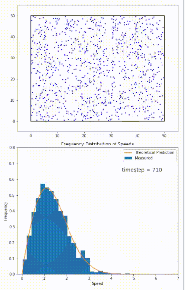 对于被限制在平面内运动的粒子,其速率分布由下式给出: $$ P(s < |\mathbf{v}| < s + ds) = \frac{m s}{k_{\text{B}} T} \exp\left( -\frac{m s^2}{2 k_{\text{B}} T} \right) ds~ $$ 这个分布用于描述处于平衡态的系统。然而,大多数系统一开始并不在平衡状态。系统向平衡态的演化过程由玻尔兹曼方程所控制。该方程预测,在短程相互作用下,系统最终的平衡速度分布将遵循麦克斯韦–玻尔兹曼分布。右图展示了一个分子动力学(MD)模拟:900 个硬球粒子被限制在一个矩形区域内运动,粒子之间通过完全弹性碰撞相互作用。该系统初始处于非平衡态,但其速度分布(蓝色)很快就收敛到二维麦克斯韦–玻尔兹曼分布(橙色)。