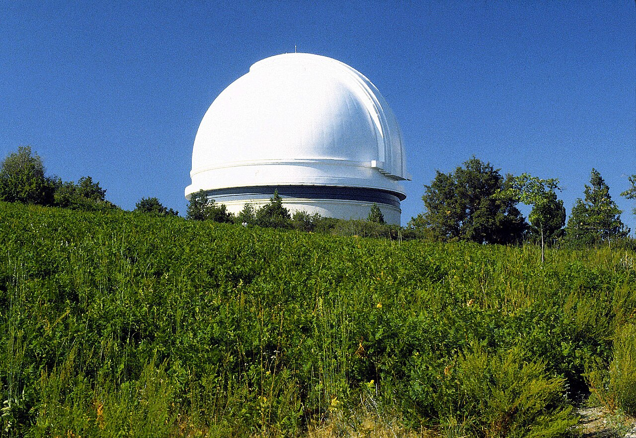 - 48 英寸(1.2 米)塞缪尔·奥申望远镜的研制始于 1938 年,望远镜于 1948 年首次成像。它最初被称为 48 英寸施密特望远镜,并于 1986 年以塞缪尔·奥申命名 $^{[4]}$。在众多重要成果中,奥申望远镜的观测促成了重要矮行星厄里斯(Eris)与赛德娜(Sedna)的发现 $^{[18]}$。厄里斯的发现引发国际天文学界的讨论,最终导致冥王星于 2006 年被重新分类为矮行星。奥申望远镜目前实现完全机器人化运行,并搭载 5.7 亿像素的 ZTF 相机 $^{[19]}$,作为 ZTF 项目的 “发现引擎”。