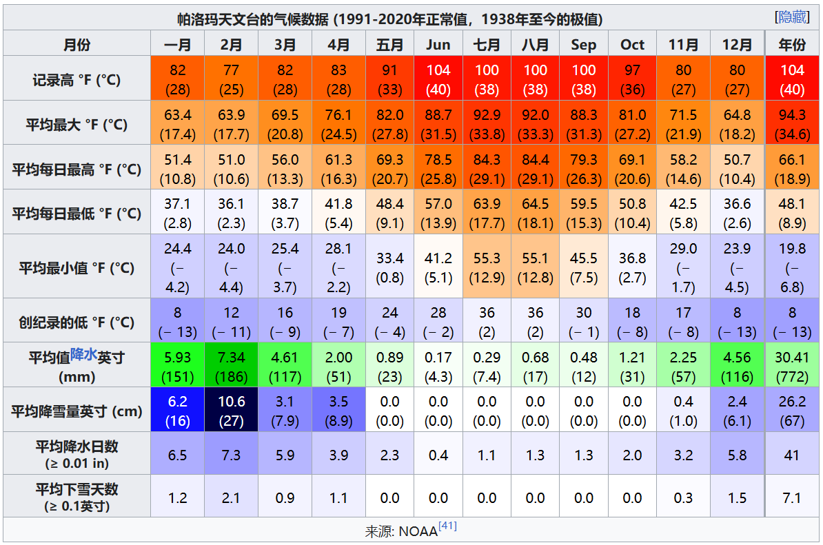 帕洛马属炎热夏季地中海气候(柯本气候分类 Csa)。