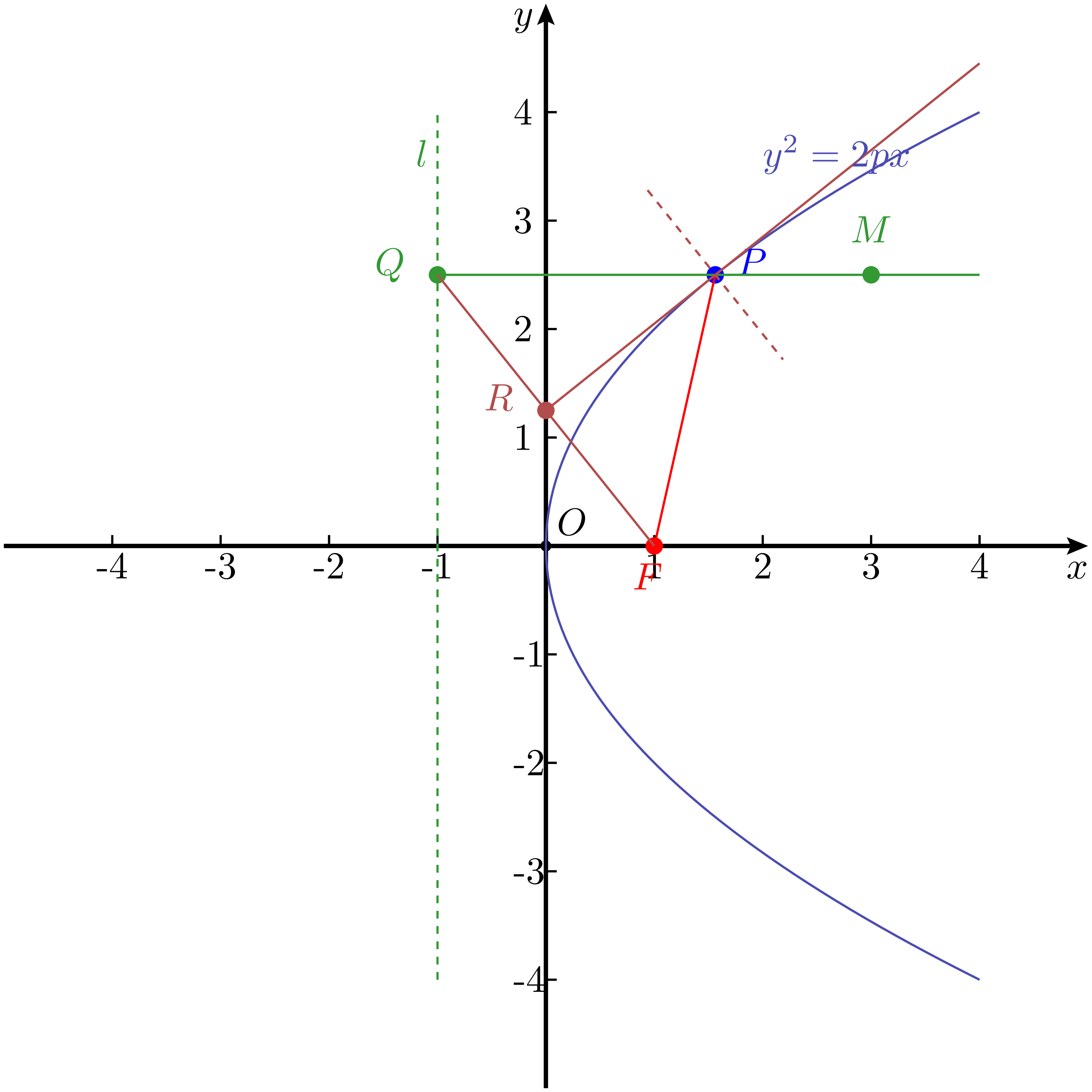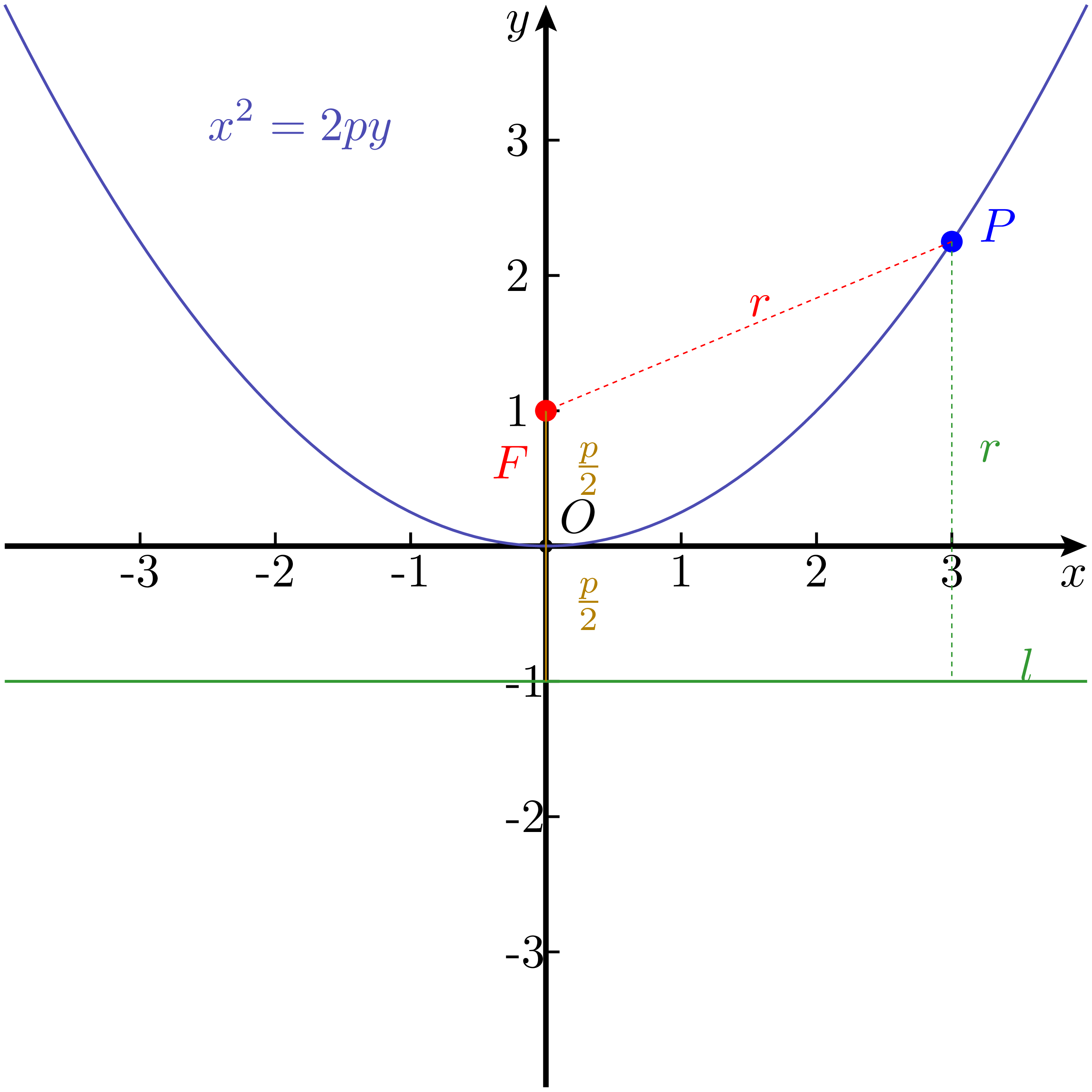 这个式子正是一个开口向上的二次函数,其图像是顶点在原点、对称轴为 $y$ 轴的曲线。换句话说,从 “点到定点的距离等于它到定直线的距离” 这一条件出发,所得到的轨迹,恰好就是一条抛物线。事实上,这个条件本身也就是抛物线的定义。