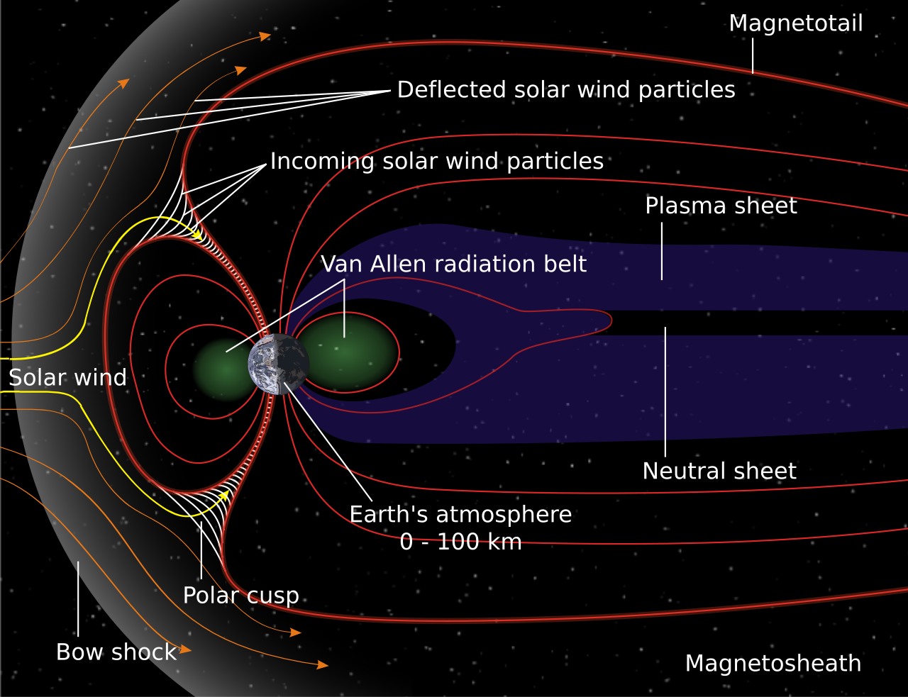行星的一项重要特征是其本征磁矩,而本征磁矩又会产生磁层。磁场的存在表明行星在地质学意义上仍然 “活着”。换言之,具有磁化性质的行星在其内部存在电导流体的流动,从而产生磁场。这些磁场会显著改变行星与太阳风之间的相互作用。一个具有磁化的行星会在其周围的太阳风中开辟出一个空腔,这个区域称为磁层(magnetosphere),太阳风无法穿透其中。磁层的尺寸可能远大于行星本身。相反,非磁化行星只能依靠电离层与太阳风的相互作用而形成较小的诱导磁层,这种磁层无法有效保护行星 \(^\text{[137]}\)。
