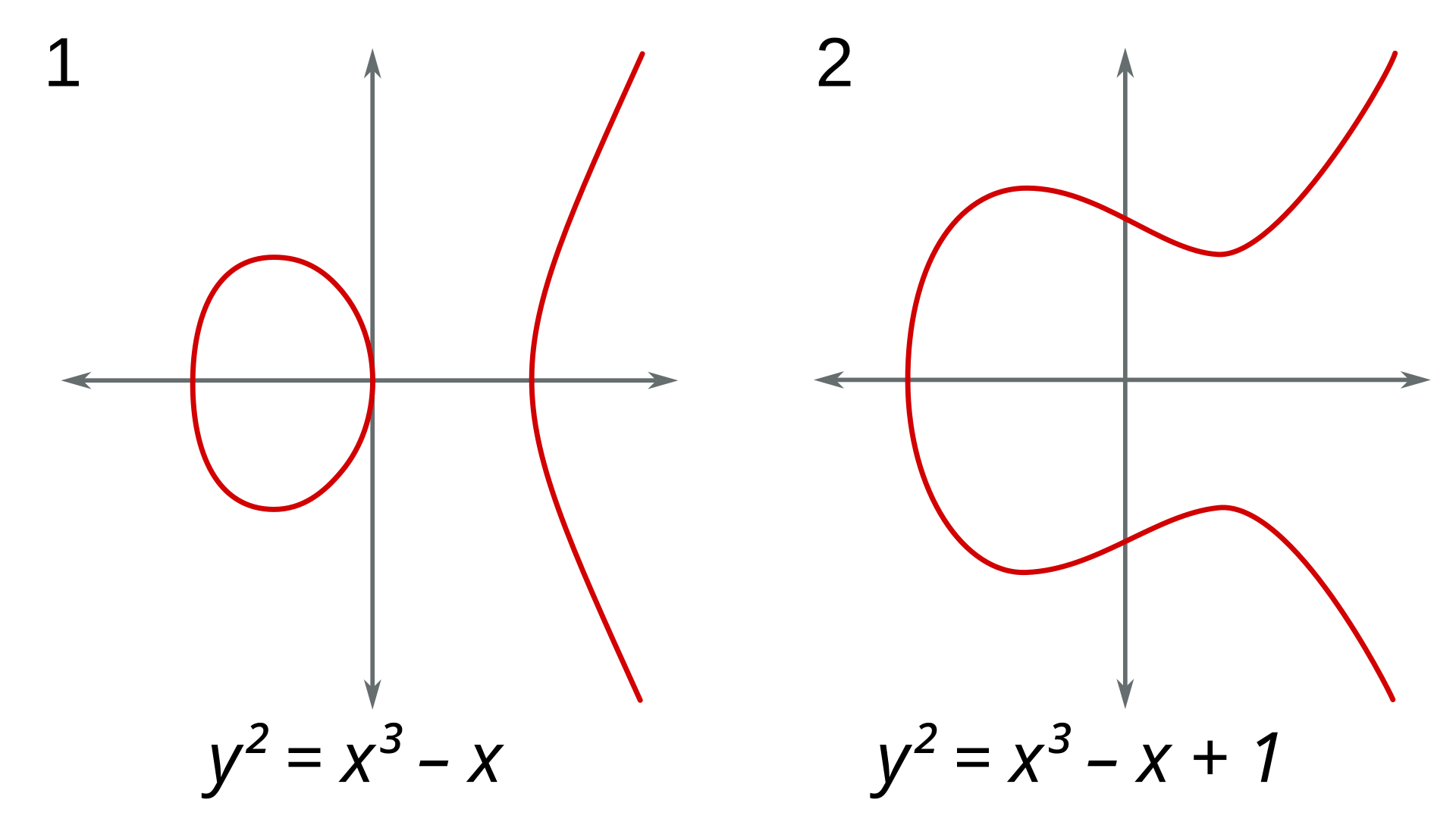 图 13:两个椭圆曲线的例子,即亏格为 1 且至少有一个有理点的曲线。