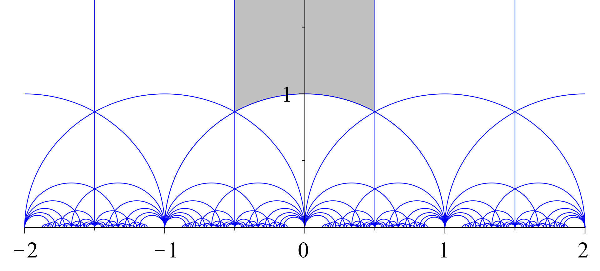 图 11:模群在上半平面的作用。灰色区域是标准基本域。