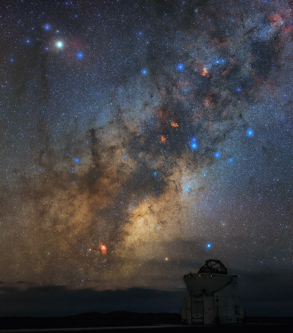 图 3:天蝎座与银河系,同画面中可见心宿二(Antares)附近的 M4 与 M80,画面中央下方的 M6 与 M7,画面顶部的 NGC\,6124,以及画面中央正上方的 NGC\,6334。