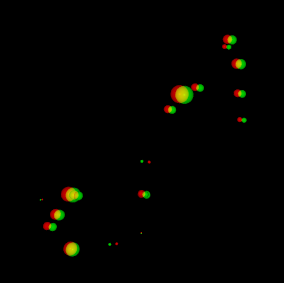 图 2:按距离(红--绿三维视图)显示的天蝎座恒星分布,以及各恒星亮度(以恒星大小表示)