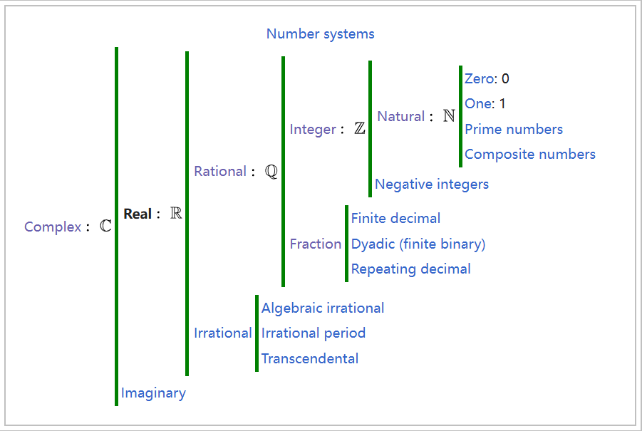 实数包括有理数,例如整数 −5 和分数 $4/3$。其余的实数称为无理数。一些无理数(以及所有有理数)是具有整系数多项式的根,例如平方根 $\sqrt{2} = 1.414...$;这些数被称为代数数。而也存在一些并非如此的实数,例如 $\pi = 3.1415...$;这些数被称为超越数。\(^\text{[3]}\)
