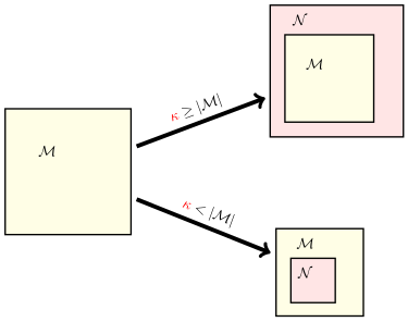 首先,通过为 \(M\) 的每一个元素添加一个新的常数符号,扩展签名,得到扩展签名 \(\sigma'\)。在这个扩展签名下,\(M\) 的完整理论称为其初等图像(elementary diagram)。接着,向签名中再加入 \(\kappa\) 个新的常数符号,并向 \(M\) 的初等图像中添加句子 \(c \neq c'\)(其中 \(c, c'\) 是任意两个不同的新常数符号)。根据紧致性定理(compactness theorem),该理论是一致的。由于其模型的基数至少为 \(\kappa\),根据该定理的 “向下部分”,我们可以得到一个恰好具有基数 \(\kappa\) 的模型 \(N\)。该模型 \(N\) 含有 \(M\) 的一个同构拷贝,且该拷贝是 \(N\) 的一个初等子结构。\(^\text{[6][7]:100–102}\)