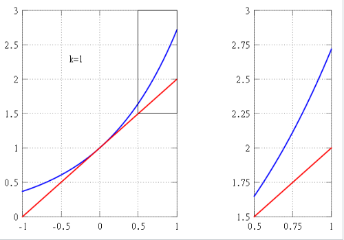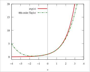 假设我们希望在区间 \( [-1, 1] \) 上找到函数 \( f(x) = e^x \) 的近似值,同时确保近似误差不超过 \( 10^{-5} \)。在这个示例中,我们假设我们只知道指数函数的以下性质: \[ e^0 = 1, \quad \frac{d}{dx} e^x = e^x, \quad e^x > 0, \quad x \in \mathbb{R}.\qquad \text{(★)}~ \] 从这些性质可以得出,\( f^{(k)}(x) = e^x \) 对于所有 \( k \) 都成立,特别地,\( f^{(k)}(0) = 1 \)。因此,函数 \( f \) 在 \( 0 \) 处的 \( k \) 阶泰勒多项式及其拉格朗日形式的余项给出如下: \[ P_k(x) = 1 + x + \frac{x^2}{2!} + \cdots + \frac{x^k}{k!},~ \] \[ R_k(x) = \frac{e^\xi}{(k+1)!} x^{k+1},~ \] 其中 \( \xi \) 是介于 \( 0 \) 和 \( x \) 之间的某个数。由于 \( e^x \) 是递增的(根据公式★),我们可以直接使用 \( e^x \leq 1 \) 对于 \( x \in [-1, 0] \) 来估计区间 \( [-1, 0] \) 上的余项。为了得到区间 \( [0, 1] \) 上余项的上界,我们使用性质 \( e^\xi < e^x \) 对于 \( 0 < \xi < x \),从而估计: \[ e^x = 1 + x + \frac{e^\xi}{2} x^2 < 1 + x + \frac{e^x}{2} x^2, \quad 0 < x \leq 1,~ \] 使用二阶泰勒展开。然后我们求解 \( e^x \),得出: \[ e^x \leq \frac{1 + x}{1 - \frac{x^2}{2}} = 2 \frac{1 + x}{2 - x^2} \leq 4, \quad 0 \leq x \leq 1,~ \] 通过最大化分子并最小化分母。结合这些关于 \( e^x \) 的估计,我们可以看到: \[ |R_k(x)| \leq \frac{4 |x|^{k+1}}{(k+1)!} \leq \frac{4}{(k+1)!}, \quad -1 \leq x \leq 1,~ \] 因此,当 \[ \frac{4}{(k+1)!} < 10^{-5} \quad \Longleftrightarrow \quad 4 \cdot 10^5 < (k+1)! \quad \Longleftrightarrow \quad k \geq 9,~ \] (参见阶乘或手动计算值 \( 9! = 362880 \) 和 \( 10! = 3628800 \))。作为结论,泰勒定理得到如下近似: \[ e^x = 1 + x + \frac{x^2}{2!} + \cdots + \frac{x^9}{9!} + R_9(x), \quad |R_9(x)| < 10^{-5}, \quad -1 \leq x \leq 1.~ \] 例如,这个近似提供了一个小数表达式:\(e \approx 2.71828\),精确到五个小数位。