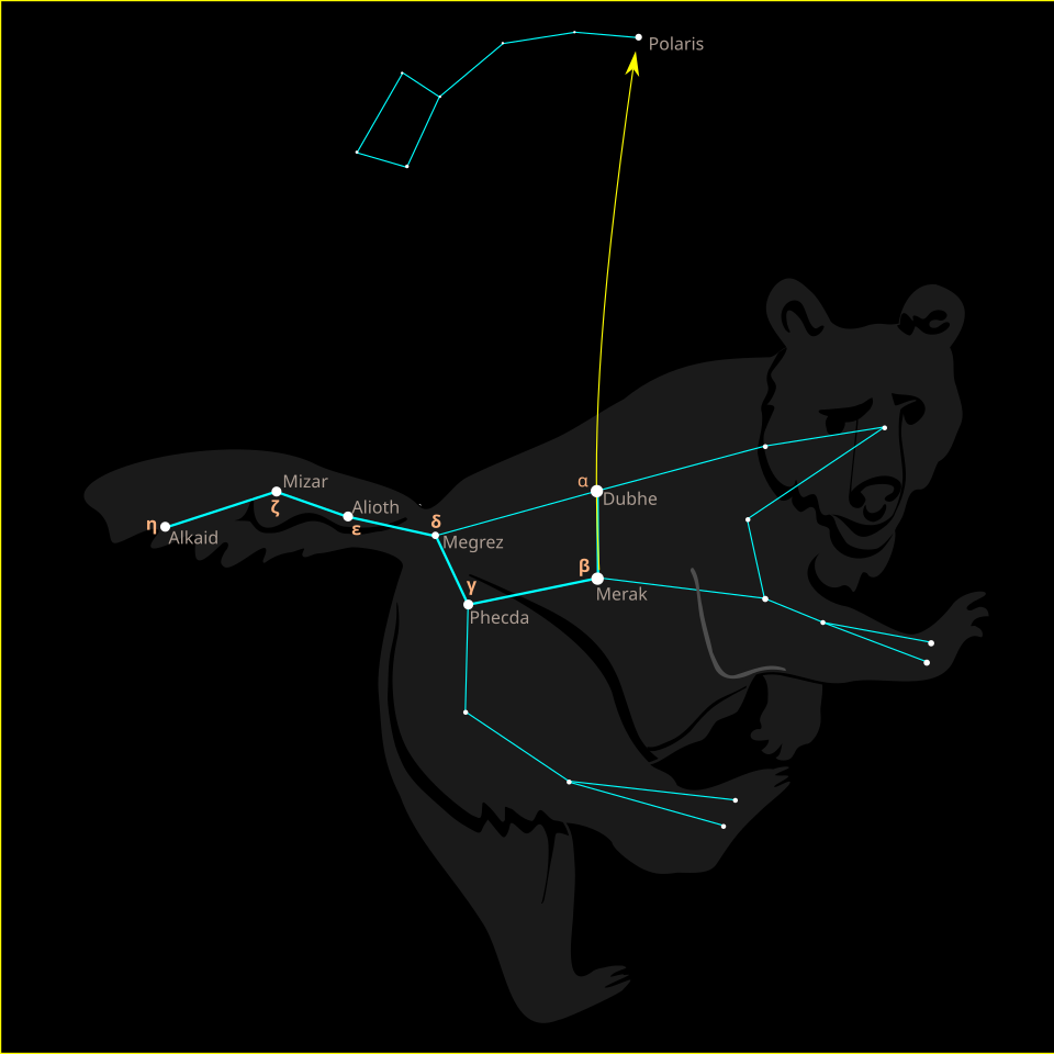 大熊座最为人熟知的是由其七颗主星构成的星群,这一星群在不同文化中被称为 “大斗”“马车”“查理的车” 或 “犁” 等名称。尤其值得注意的是,“大斗” 的恒星排列形态在视觉上与 “小斗” 相呼应。其中的两颗恒星——天枢与天璇(分别为大熊座 $\alpha$ 星与 $\beta$ 星,Dubhe 与 Merak)——可作为导航指示星,用来指向当前的北极星,即位于小熊座中的北极星(Polaris)。