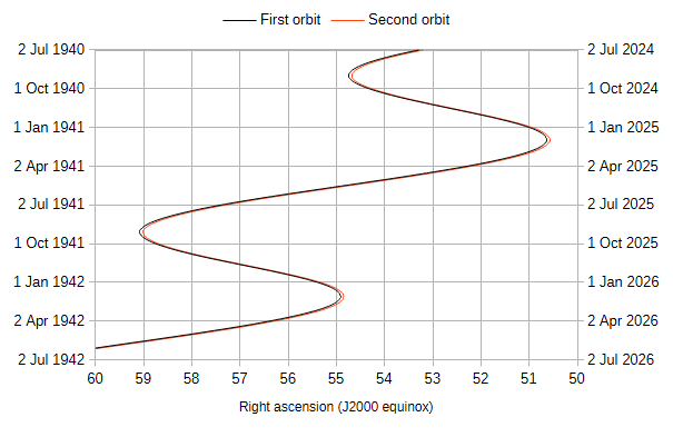由于其周期非常接近 84 年,因此它在恒星背景中的视位置与整整 84 年前几乎相同(见图)。天王星的逆行运动使其每年都会回到大致与前一年最偏东的位置相近的地方。