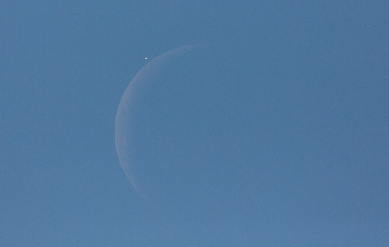 图 18:金星在白昼中常可被肉眼看见,例如在 2015 年 12 月 7 日月掩事件发生前不久所观测到的情形。