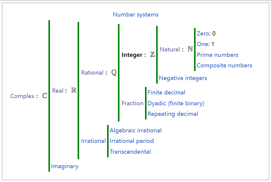 a.更准确地说,每一个数系都被嵌入到下一个数系中,并同构地映射到其中的一个子集。\(^\text{[5]}\) 通常假定的集合论包含关系,可以通过以下方式得到:先构造实数,然后舍弃之前的构造,并将其他数集定义为实数的子集。\(^\text{[6]}\)