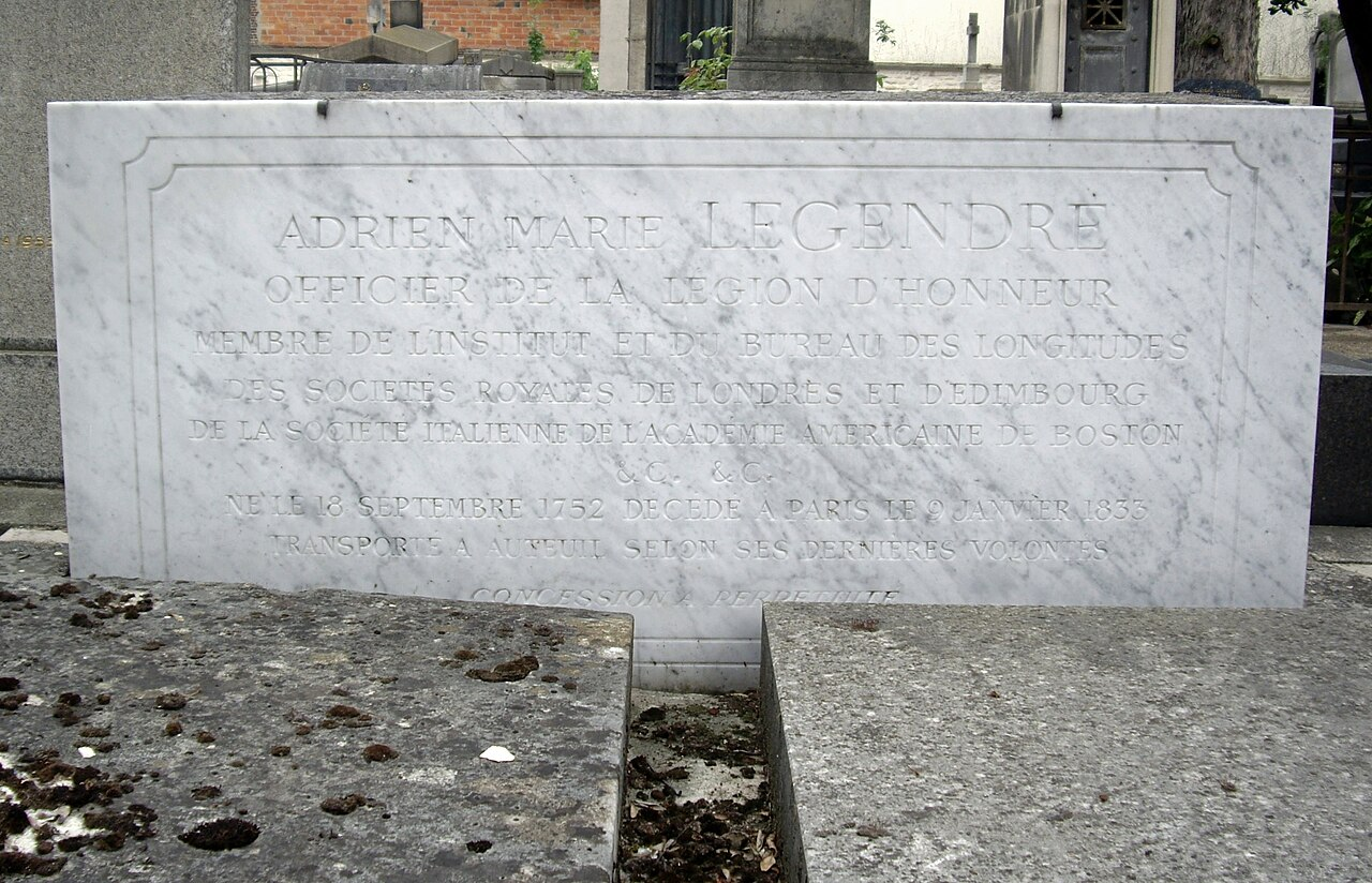 阿贝尔在椭圆函数方面的研究是建立在勒让德工作的基础之上的,而高斯在统计学和数论方面的一些成果则完善了勒让德的工作。他发展并最早在高斯之前向同时代人传播了最小二乘法 \(^\text{[8]}\),这一方法在线性回归、信号处理、统计学和曲线拟合中有广泛应用;该方法于 1806 年以附录形式刊登在他关于彗星轨道的著作中。如今,“最小二乘法” 一词正是从法语 “méthode des moindres carrés” 直译而来。