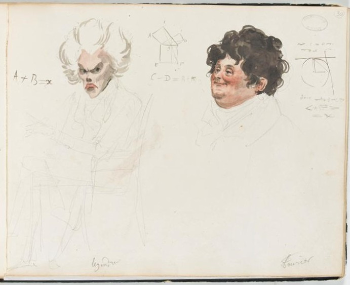 图 4:1820 年,法国艺术家朱利安-莱奥波德·布瓦伊绘制的法国数学家阿德里安-玛丽·勒让德(左)与约瑟夫·傅里叶(右)的水彩讽刺肖像,分别为《法兰西学院成员的 73 幅水彩讽刺画像集》中的第 29 号与第 30 号肖像。\(^\text{[12]}\)