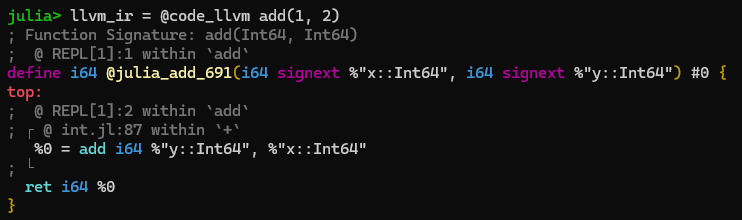 llvm_ir = @code_llvm add(1, 2) # 生成 LLVM IR